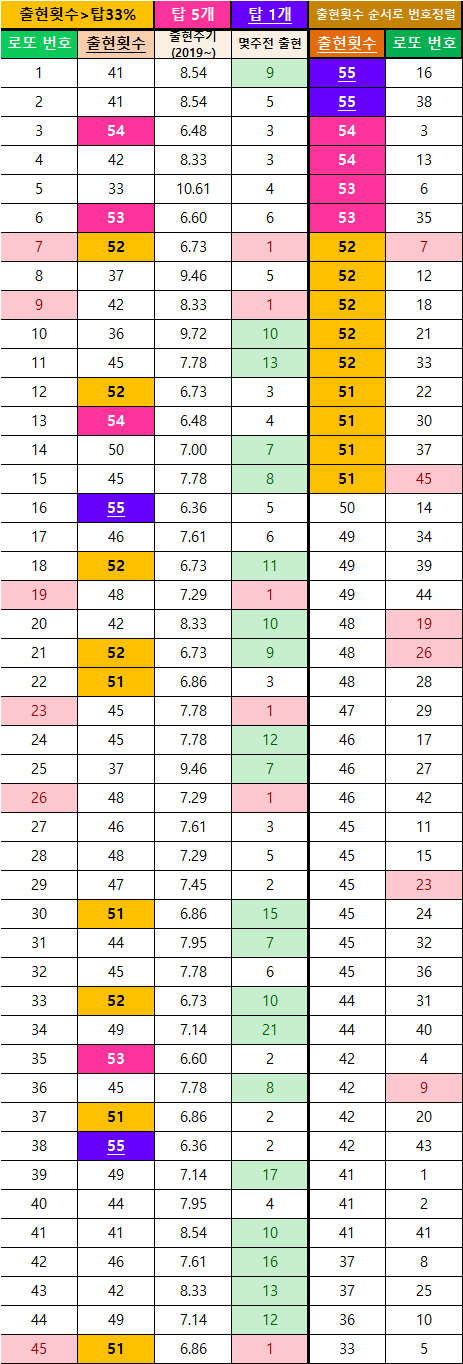 (※로또번호 45개의 출현 횟수를 2가지로 정리해 보았습니다. 첫 번째는 동행로또(2019~)의 출현 횟수이고, 두 번째는 1회 때부터의 번호들을 정리하였습니다. 로또번호들이 매회차 나오는 것을 맞추기는 매우 어렵고, 딱히 규칙성도 없는 편입니다. 하지만, 첫 번째와 두 번째 표들의 정리데이터를 보면 알 수 있듯이, 자주 나오는 번호들은 잘 안 나오는 숫자들에 비해서 상당한 출현 횟수를 지니고 있습니다. 이것은 즉, 어느 정도의 규칙적인 패턴이 존재한다는 것임을 알 수 있습니다. 필자가 표로 정리한 이미지 데이터를 참고해서, 독자님들의 나만의 예상번호와 고정수를 만들어 보세요.)