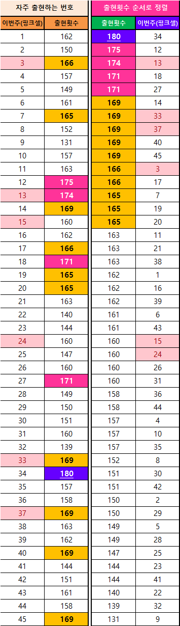 (※로또번호 45개의 출현 횟수를 2가지로 정리해 보았습니다. 첫 번째는 동행로또(2019~)의 출현 횟수이고, 두 번째는 1회 때부터의 번호들을 정리하였습니다. 로또번호들이 매회차 나오는 것을 맞추기는 매우 어렵고, 딱히 규칙성도 없는 편입니다. 하지만, 첫 번째와 두 번째 표들의 정리데이터를 보면 알 수 있듯이, 자주 나오는 번호들은 잘 안 나오는 숫자들에 비해서 상당한 출현 횟수를 지니고 있습니다. 이것은 즉, 어느 정도의 규칙적인 패턴이 존재한다는 것임을 알 수 있습니다. 필자가 표로 정리한 이미지 데이터를 참고해서, 독자님들의 나만의 예상번호와 고정수를 만들어 보세요.)