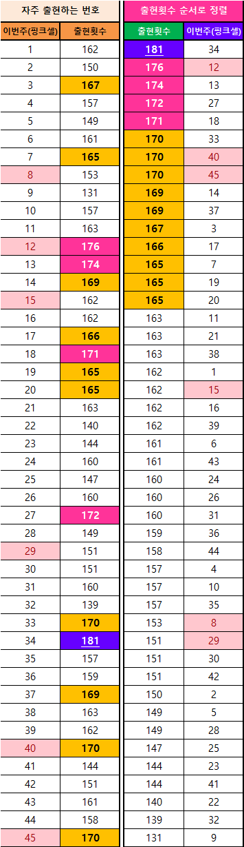 (※로또번호 45개의 출현 횟수를 2가지로 정리해 보았습니다. 첫 번째는 동행로또(2019~)의 출현 횟수이고, 두 번째는 1회 때부터의 번호들을 정리하였습니다. 로또번호들이 매회차 나오는 것을 맞추기는 매우 어렵고, 딱히 규칙성도 없는 편입니다. 하지만, 첫 번째와 두 번째 표들의 정리데이터를 보면 알 수 있듯이, 자주 나오는 번호들은 잘 안 나오는 숫자들에 비해서 상당한 출현 횟수를 지니고 있습니다. 이것은 즉, 어느 정도의 규칙적인 패턴이 존재한다는 것임을 알 수 있습니다. 필자가 표로 정리한 이미지 데이터를 참고해서, 독자님들의 나만의 예상번호와 고정수를 만들어 보세요.)