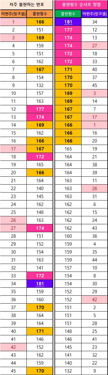 (※로또번호 45개의 출현 횟수를 2가지로 정리해 보았습니다. 첫 번째는 동행로또(2019~)의 출현 횟수이고, 두 번째는 1회 때부터의 번호들을 정리하였습니다. 로또번호들이 매회차 나오는 것을 맞추기는 매우 어렵고, 딱히 규칙성도 없는 편입니다. 하지만, 첫 번째와 두 번째 표들의 정리데이터를 보면 알 수 있듯이, 자주 나오는 번호들은 잘 안 나오는 숫자들에 비해서 상당한 출현 횟수를 지니고 있습니다. 이것은 즉, 어느 정도의 규칙적인 패턴이 존재한다는 것임을 알 수 있습니다. 필자가 표로 정리한 이미지 데이터를 참고해서, 독자님들의 나만의 예상번호와 고정수를 만들어 보세요.)