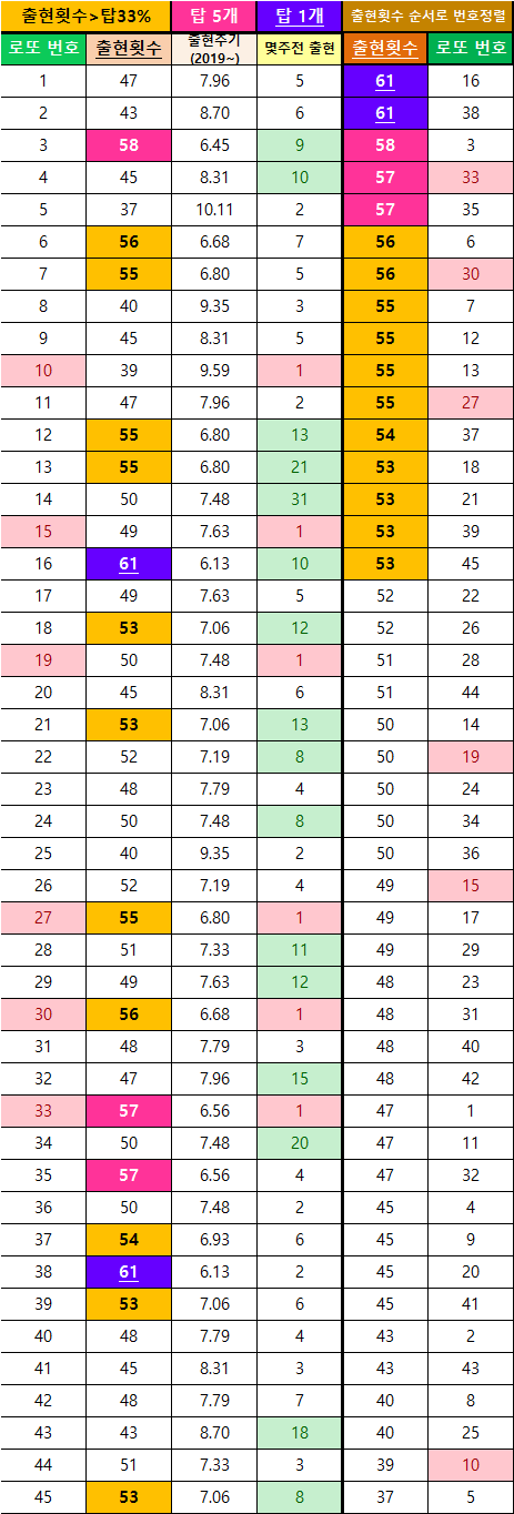 (※로또번호 45개의 출현 횟수를 2가지로 정리해 보았습니다. 첫 번째는 동행로또(2019~)의 출현 횟수이고, 두 번째는 1회 때부터의 번호들을 정리하였습니다. 로또번호들이 매회차 나오는 것을 맞추기는 매우 어렵고, 딱히 규칙성도 없는 편입니다. 하지만, 첫 번째와 두 번째 표들의 정리데이터를 보면 알 수 있듯이, 자주 나오는 번호들은 잘 안 나오는 숫자들에 비해서 상당한 출현 횟수를 지니고 있습니다. 이것은 즉, 어느 정도의 규칙적인 패턴이 존재한다는 것임을 알 수 있습니다. 필자가 표로 정리한 이미지 데이터를 참고해서, 독자님들의 나만의 예상번호와 고정수를 만들어 보세요.)