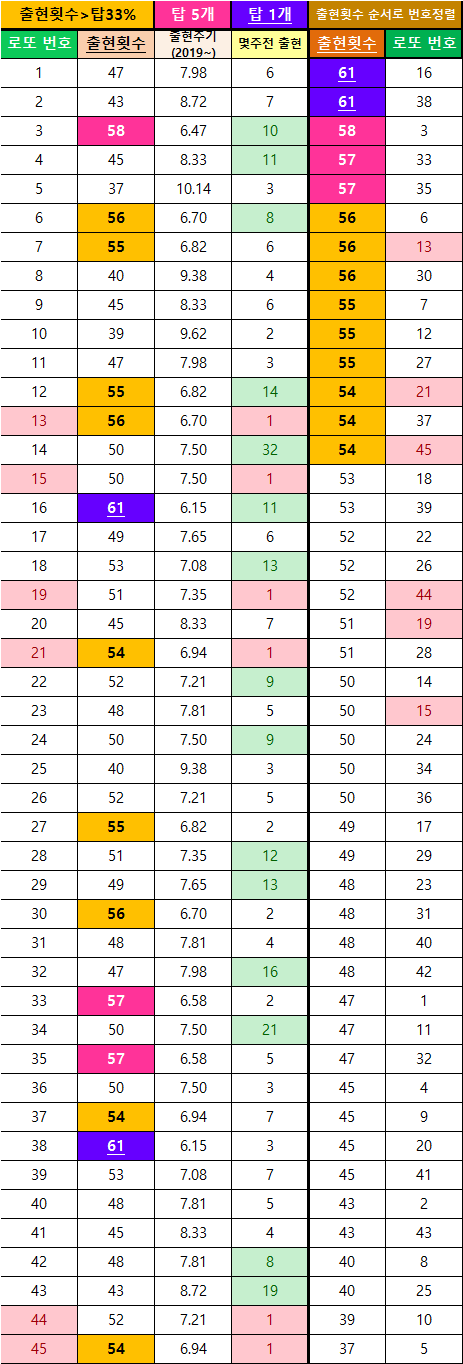(※로또번호 45개의 출현 횟수를 2가지로 정리해 보았습니다. 첫 번째는 동행로또(2019~)의 출현 횟수이고, 두 번째는 1회 때부터의 번호들을 정리하였습니다. 로또번호들이 매회차 나오는 것을 맞추기는 매우 어렵고, 딱히 규칙성도 없는 편입니다. 하지만, 첫 번째와 두 번째 표들의 정리데이터를 보면 알 수 있듯이, 자주 나오는 번호들은 잘 안 나오는 숫자들에 비해서 상당한 출현 횟수를 지니고 있습니다. 이것은 즉, 어느 정도의 규칙적인 패턴이 존재한다는 것임을 알 수 있습니다. 필자가 표로 정리한 이미지 데이터를 참고해서, 독자님들의 나만의 예상번호와 고정수를 만들어 보세요.)