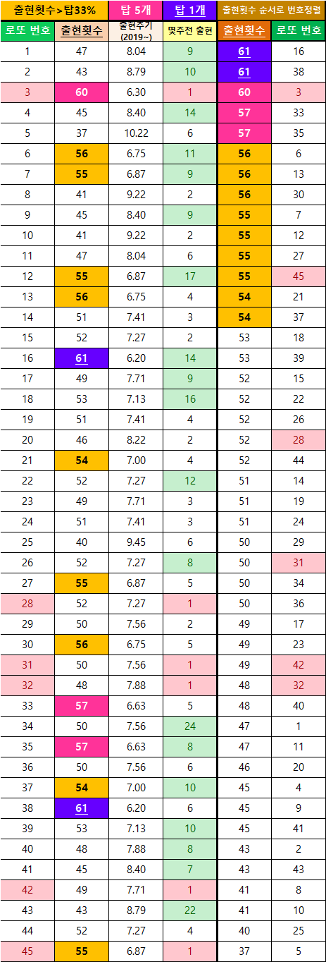 (※로또번호 45개의 출현 횟수를 2가지로 정리해 보았습니다. 첫 번째는 동행로또(2019~)의 출현 횟수이고, 두 번째는 1회 때부터의 번호들을 정리하였습니다. 로또번호들이 매회차 나오는 것을 맞추기는 매우 어렵고, 딱히 규칙성도 없는 편입니다. 하지만, 첫 번째와 두 번째 표들의 정리데이터를 보면 알 수 있듯이, 자주 나오는 번호들은 잘 안 나오는 숫자들에 비해서 상당한 출현 횟수를 지니고 있습니다. 이것은 즉, 어느 정도의 규칙적인 패턴이 존재한다는 것임을 알 수 있습니다. 필자가 표로 정리한 이미지 데이터를 참고해서, 독자님들의 나만의 예상번호와 고정수를 만들어 보세요.)