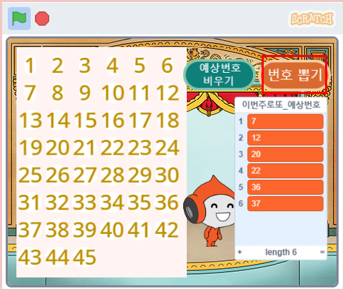 3. "번호 뽑기"버튼을 클릭하면, 로또번호 6개가 추출됩니다.(추출되면서, 숫자 크기대로 자동정렬됩니다. 동시에 캐릭터가 움직이고, 소리가 재생됩니다. 스피커 소리 크기 주의해 주세요.)