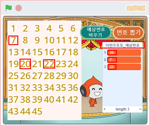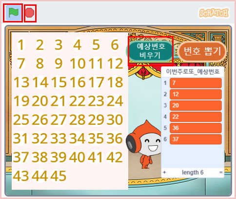 4. 게임을 다시하고 싶다면, 첫번째방법은 핑크색 팔각형버튼을 클릭하고, 녹색깃발을 클릭합니다. 두번째 방법은 "예상번호 비우기"버튼을 클릭하고, 2번 메뉴얼부터 실행하면 됩니다.
